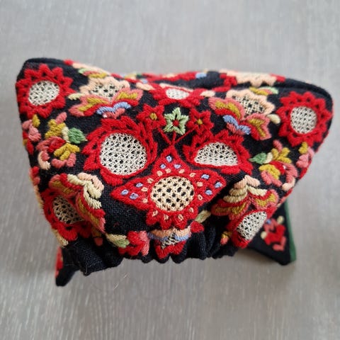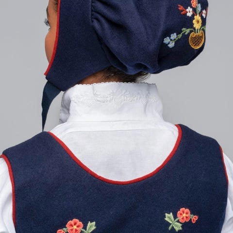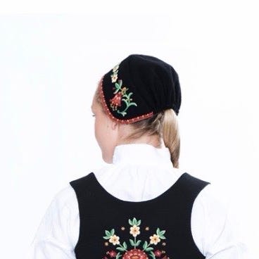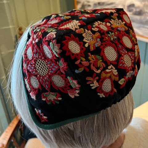 Nydelig lue til gamle Valdresbunad i marineblå. Ny pris 3500kr, aldri brukt.