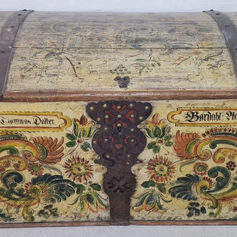 Rosemalt kiste selges for kroner 1000. Størrelse: Ca. 90 lang, 57 bred og 60 høy med buet lokk. Ved interesse kan jeg få tatt bedre bilder.