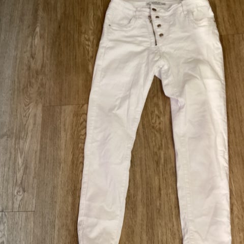 Myk hvit jeans , spesiell med usydd benkant og skrift ved linningen, se bilde