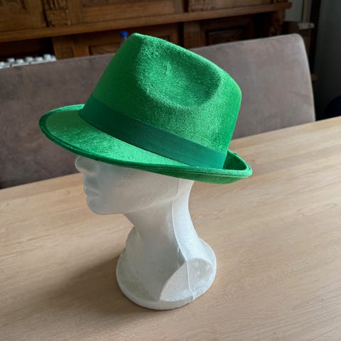 Selger fedora hatt. Brukt en gang so sjåør i brudebil. Ettermontert hvitt silkebånd.
