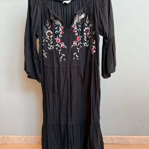 Pen kjole fra Junarose med nydelig broderi fremme. Knyting i livet og godt stoff.