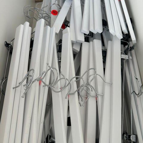 Veldig fint og praktisk stativ til å henge ulike varer på. Jeg har 3 stk. metall og tre. Armene kan justeres i høyden. Må hentes, fast pris