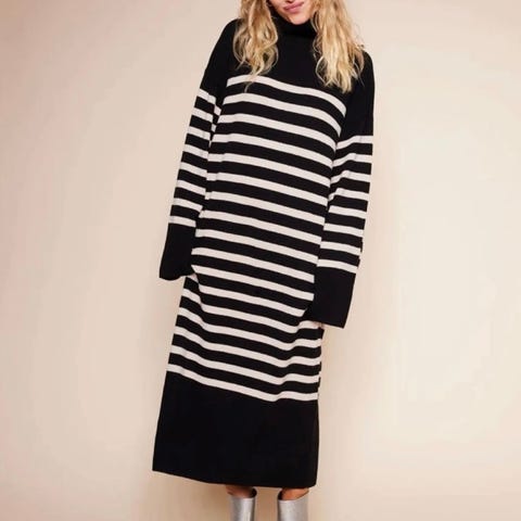 Stripete, langermet maxikjole fra InWear. MaloneIW Dress har lange, trompetermer og en lett innsvingt silhuett med rett maxiskjørt. Kjolen har rund hals og sorte og hvite striper med kontrasterende panel på skuldrene.