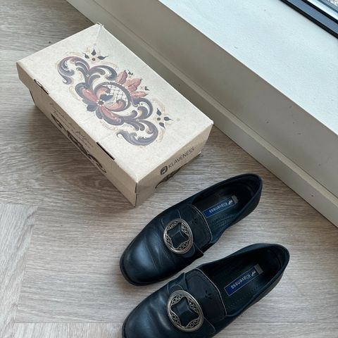 Veldig flotte og elegante bunadssko i str. 35 frå kvalitetsmerket Klaveness. Modellen heiter Klara boot. Kjøpt i mai 2023 og brukt éin enkelt gong, nokre timar på 17.mai i 2023, og framstår som nye. Ingen synlige bruksmerker, berre litt under sålen. Pris for skoene i butikk er kr.2699.