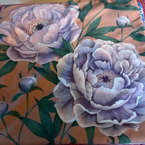 4 stk putetrekk, brune med fine blomster på. Blir et lite blikkfang i seg selv i sofaen