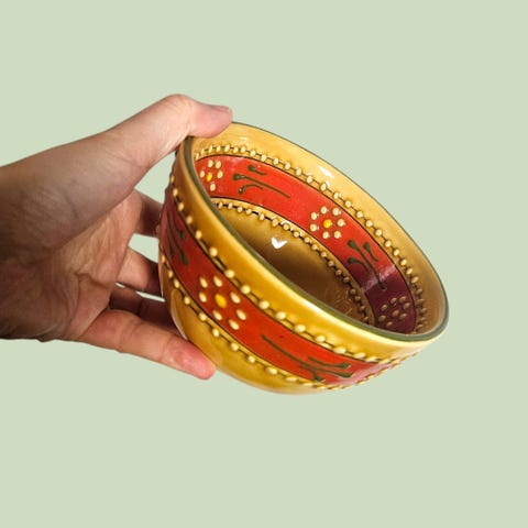 Nydelig håndmalt bolle fra Mexico – varm gulfarge med dekorative røde og grønne detaljer. Hver bolle er unik og har ekte, håndlaget sjarm 🤎