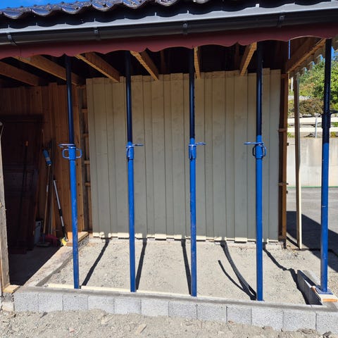 Leier ut dekkstøtter. Disse er meget solide og måler mye vekt. Kan fint støtte opp en bære vegg i et hus eller garasje