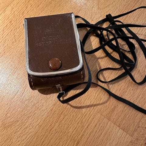 Lysbildefremviser "PAK Slide Viewer" fra Le Belle Industries, Oconomowoc, Wisconsin. Produsert 1940-1950. Kompatibel med 35mm format, 5×5 cm monterte lysbilder. Tilvirket i metall, 5.5 cm x 13,5 cm, vekt 234 gram.