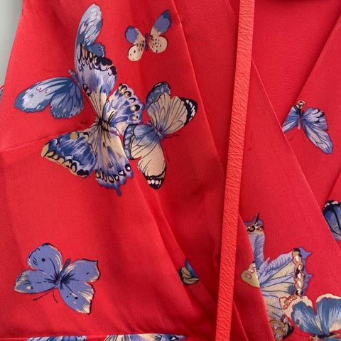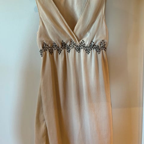Nydelig kjole i silke fra Oasis, str. 14 (40). Løs passform; har tilhørende belte. Passer fra 38-42- ish; avhengig av hvor løs man vil ha den.