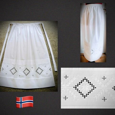 Forkle med Hardangersom. Veldig pent og velholdt høyde 50cm bredde 58cm total lende på forkle med knytebånd 151cm. Høyde i håndbroderiet 11cm. Ingen flekker eller skade.