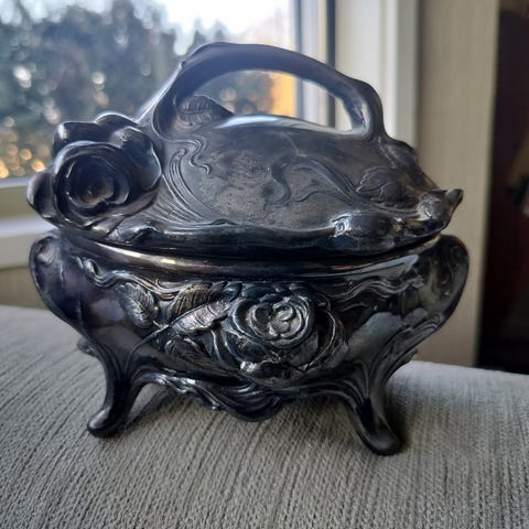 Dette er en original edwardiansk litografert metallboks for Lewison’s Brand Perfumed Soap Tablets, produsert i England av Huntley, Boorne & Stevens for Geo. Lewison & Co. Ltd. Boksen dateres til tidlig 1900-tall (ca. 1905–1918) og har et klassisk art nouveau-uttrykk i dyp grønn med rikt gulltrykk, floral dekor og original reklamegrafikk. Dette er autentisk handels- og apotekemballasje fra perioden, brukt til såpetabletter. Normal aldersrelatert slitasje, mindre bulk i lokket, ellers solid og pent bevart med svært god visuell fremtoning.