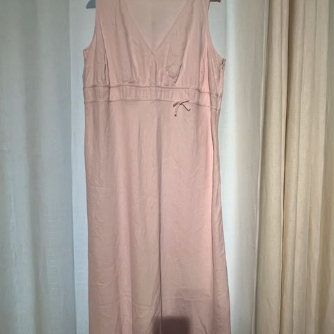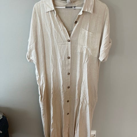 Hvit linnkjole med knapper og belte. Korte ærmer.
