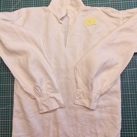 Lengden er utvidet nederst og vises ikke når bunaden er på. Litt mørk på ene mansjetten og en liten flekk på under 1 cm på skjorta foran, som ikke synes ved bruk.