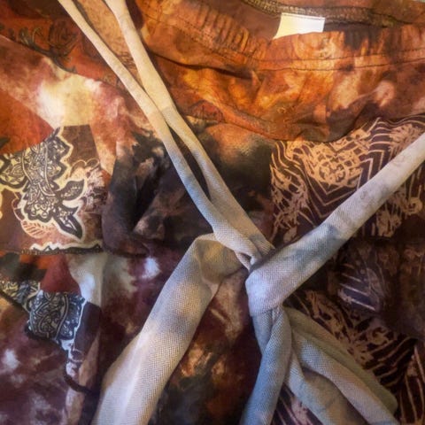 Behagelig, litt tungt, elastisk materiale, følger kroppens linjer uten å være «limt på», og med tøft og røft mønster.