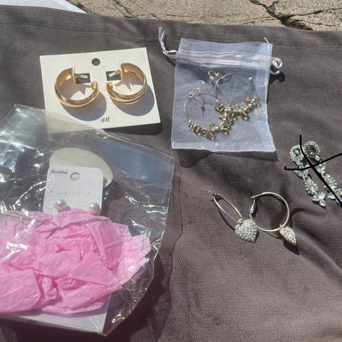 Diverse øredobber og øreringer i farger rosa, gull, sølv, turkis, lilla, lyseblå - 30 kr per par. Dråpe, hjerte, strass, cubic zirconia. Armbånd fra Accessorize 50 kr.