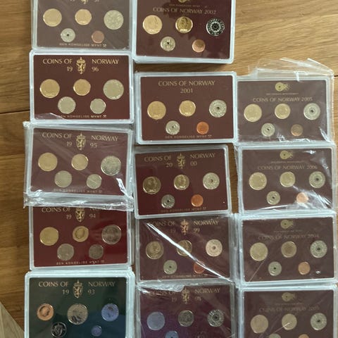 13 myntsett til salgs, Coins of Norway. 1985-1998. 1997 mangler. Noe riper og slitasje på plasten. 50 kr pr stk. Evt 550 kr for alle. Hentes, eller sendes mot betaling av frakt.