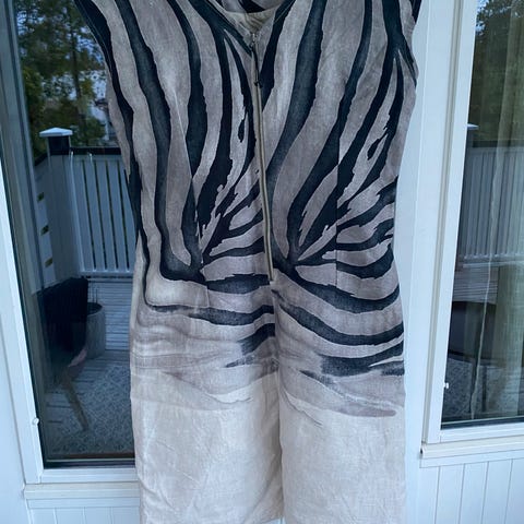 Tøff kjole/topp I 55% bomull og 45% lin. Str. 38. Kan også brukes av den som bruker str. Large. Flott struktur I stoffet . Flotte farger. Knapper, glidelås på lommene. Knapt brukt. Sender gjerne med helthjem.