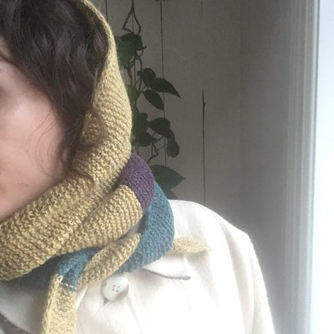 Sophie Hood fra Petite Knit. Håndstrikket i superwash ullgarn i fargen lys denim blå. Strikker i ulike farger, se mine annonser. Lengde: Ca 110 cm.