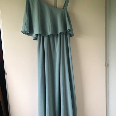Kun brukt et par ganger, selve kjolen er i fin stand, noe pynt har løsnet. Selges derfor billig. God plass til mage. Passer fint i bryllup o.l.