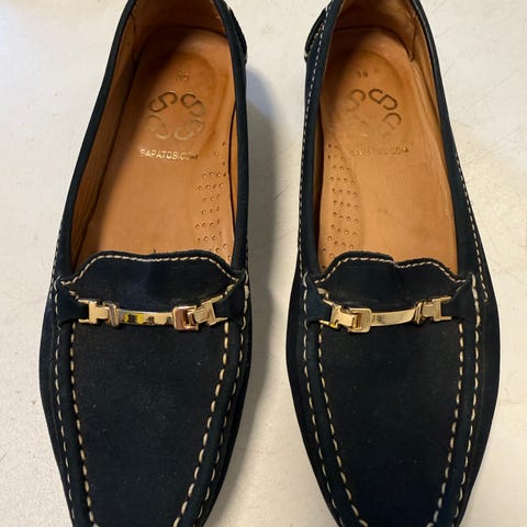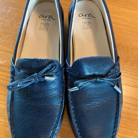 Selger disse mørkeblå Ara mokkasinene i skinn fordi de oppleves akkurat litt for små. Størrelse 5.