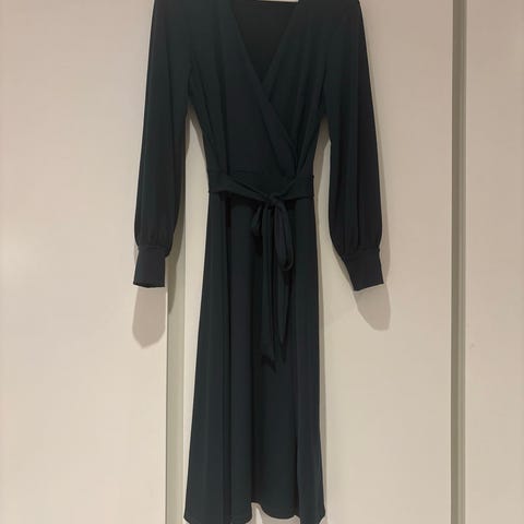 Fin og meget anvendelig omslagkjole fra Mexx i 94% viskose og 6% elastan. Størrelsen er M, men kjolen kan reguleres i livet. Omslagskjolen kan gjerne passe både en S og liten L (etter hvilken figur en har). Ermene har 2/3 lengde. Laget i Portugal og kan vaskes på 40 grader.