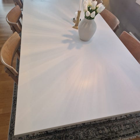 Tungt og massivt 8 seter spisebord. Har vært i bruk i 5 år nå og er fortsatt i god stand. Har lengde 220 cm med 8 seter, kan gjøres 60cm kortere ved å trekke inn platene i midten. Da blir det 6 seter. Har høyde 76cm og dybden er 90cm.