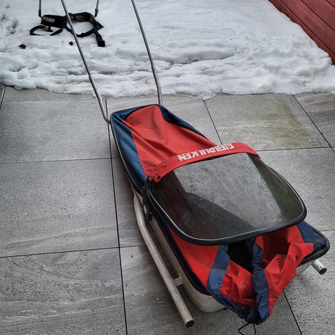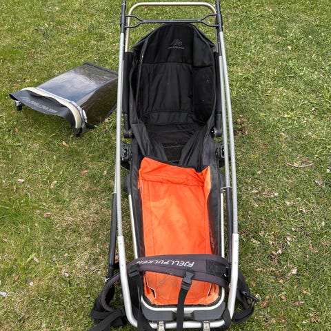 Fin pulk fra 2014. Noen riper under. Stått lagret innendørs, fin i fargen. Stroppene til beltet til å ha rundt lårene og over skuldrene har jeg aldri brukt, så de har blitt borte og medfølger da ikke.