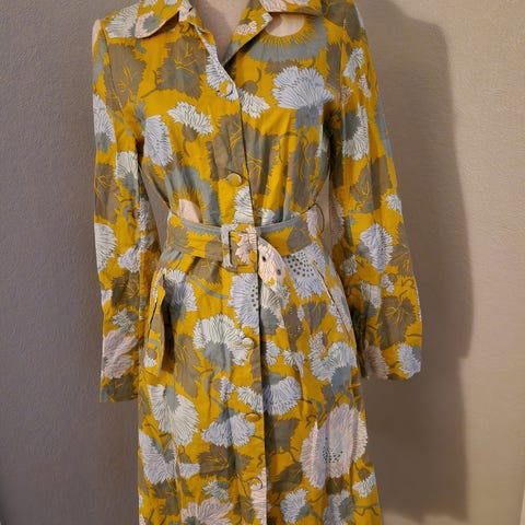 Trenchcoat har generøs krage med knapp, knytebelte med knapp bak i livet og knepping i front. Trenchcoaten er foret med lysegrønn for og har frontlommer.