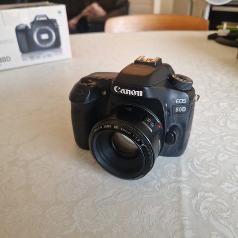 Canon 50mm f1.8 II kan følge med ved interesse, dette mangler bakdeksel, men har vært oppbevart i eske og har ingen skader.