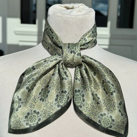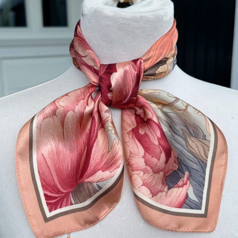 Lilla/grønnfarger i mange toner. Passer veldig fint til bunad også. Mykt og behagelig. Veldig fin silke i skjerfet, da det er er mulberry silke som er den beste silke kvaliteten. Enkelt å dandere på ulike måter da silken er så fin. Det blir litt ulikt uttrykk på fargene som vises etter hvilken ende man bruker ut, så passer til mange antrekk. Se bilder. Helt som nytt. Størrelse 53x53cm. Kan gjerne sende med posten til 46.-