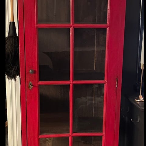 Pent brukt industrielt skap selges grunnet flytting. Svart med hyller. Glass de øverste dørene og dekkende under. Rommer mye. Passet til stue, kjøkken, gang og soverom. Kjøpt på Home & cottage for 3 år siden. Passer godt om du har liten plass.