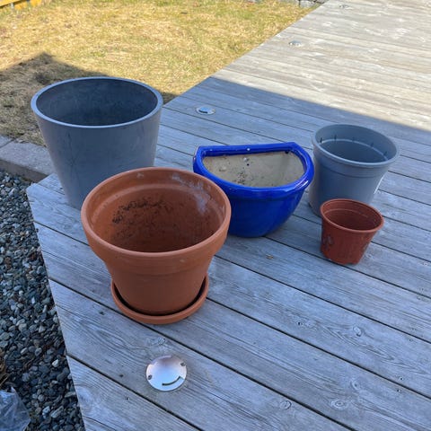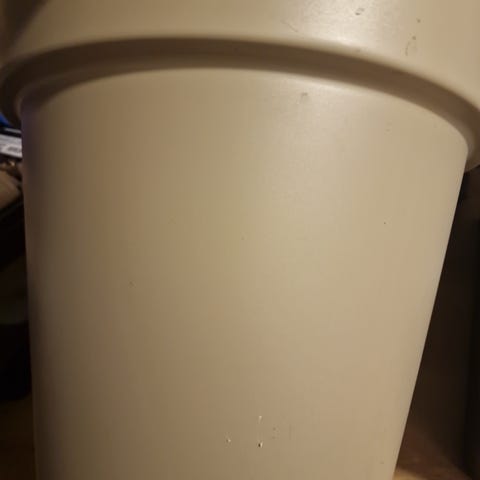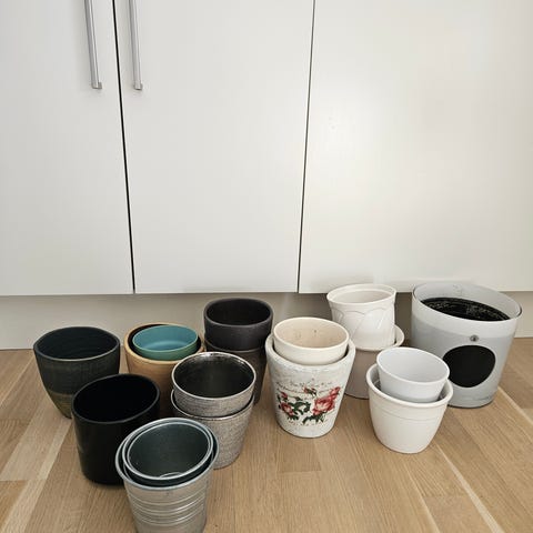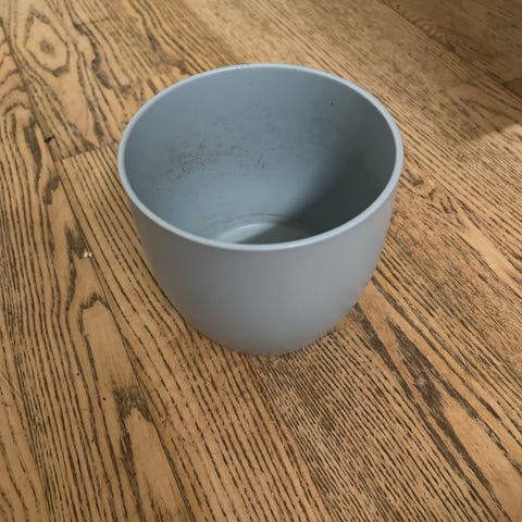 Potteskjuler med glasur som er laget for å se ut som den er krakkellert. Har blitt svak i fargen noen steder. Høyde 14 cm, diameter 12 cm øverst.