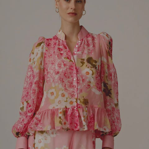 Vakre volangermer med bred åpning. Lys rosa bunn med broderte blomster i stoffet. Strikk 7 halsen. Veil pris: 2699 kr. Selges rimelig.