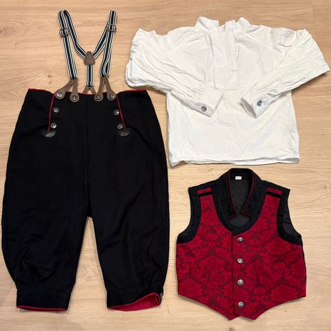 Vi selger ubrukt festdrakt i str 116 og to hvite bunadskjorter i str 116. Den ene skjorta har litt misfarging på kragen (gult), men ellers er de som nye.