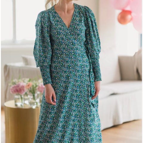 Nydelig kjole med fint fall og vakker tekstil. Fine ballongermer som legger seg fint, men som er en fin detalj.