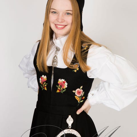 Nydelig bunad i sort ull. Dovrebunad med rosa detaljer. Str M. Fine broderinger.