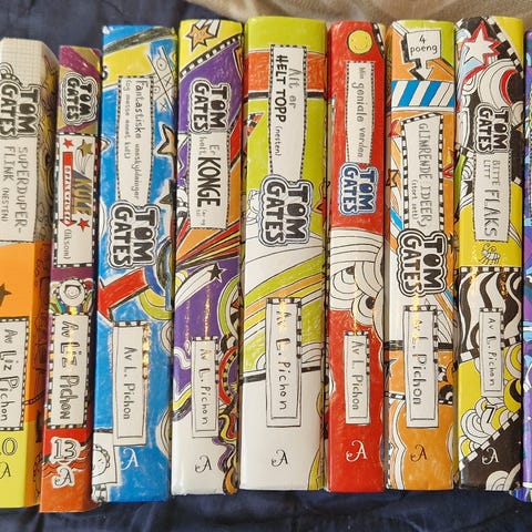 6 barnebøker av Tom Gates, kjøpt nye fra bokhandel.