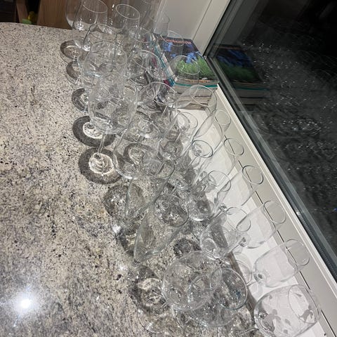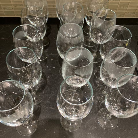 Diverse vin- og champagneglass (28 stk.). Litt matte i glasset, men virker som de skal:-)