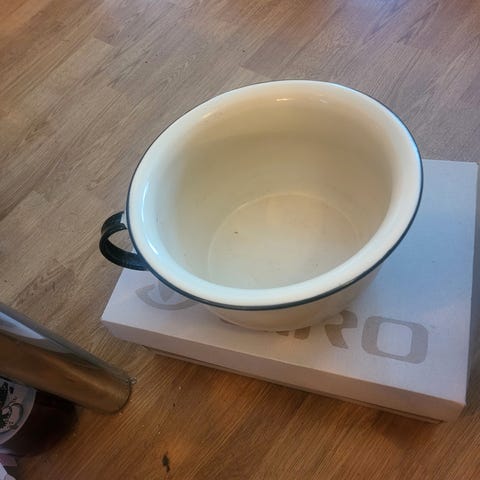 Rød kasserolle( uten lokk) er 24 cm i diameter.