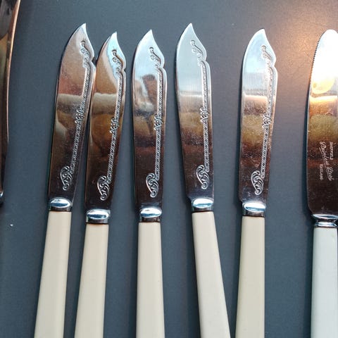 Fire kniver, en Märtha og tre Skaugum. De er litt rufsete og selges derfor til en hyggelig minstepris. Litt forskjellige i størrelse og utforming. En av de små har et merke på bladet (se bilde). Skaftene på de store er lett gulnet og har noe slitasje og merker. Ingen sprekker på skaftene. 21 og 23 cm lange.