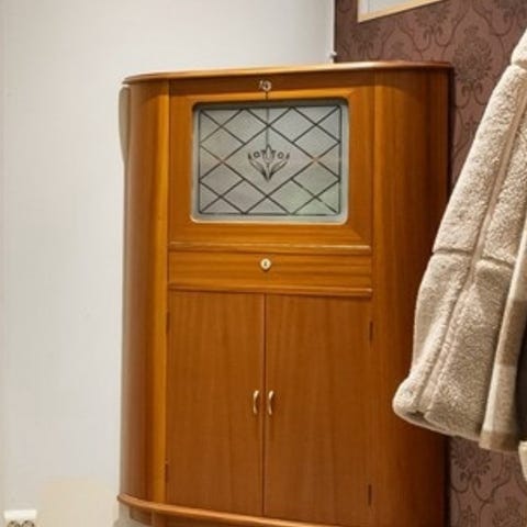 Hjørneskap fra 70-tallet. En liten skade i øverste hjørne og enkelte bruksmerker, men helt og i orden.