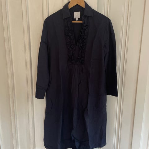 Nydelig kjole fra Vince. Bomull og lin blanding. Brukt noen få ganger. Kjole kjøpt hos Bolina. Mørk blå. Ny pris 5700,- Kan brukes både med og uten knytebelte. Den er helt mørk blå. Bildene viser fargen dårlig, ser skjoldete ut, det er den ikke.