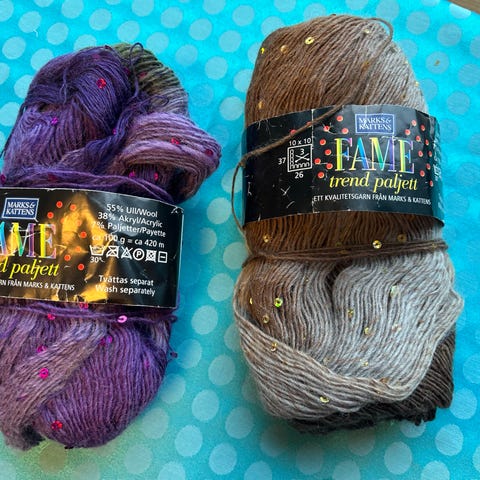 Håndfarget garn, hesper er 100 gr. Jeg har bare 2 nøster.