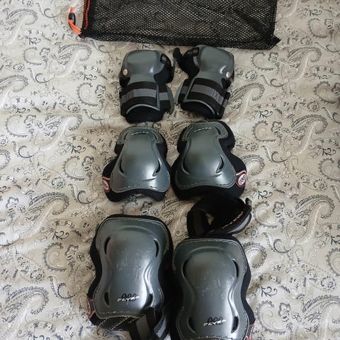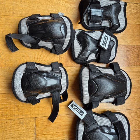 Sett med knebeskyttere, albuebeskyttere og håndleddsbeskyttere. Passer til sykling, sparkesykkel, skateboard og inline skating mm. Lett å ta på og festes med borrelås.