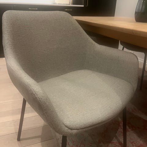 Kjempefine spisestuestoler i grå velour med svarte I god stand, men på den ene sitteputen har et par sting løsnet slik at den ikke er like «rynkete» (se bilde). Det bør være enkelt å fikse hvis man har nål og trå, men det er ikke veldig synlig. Jeg kan ikke finne noen store merker.