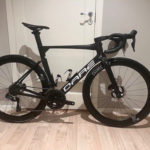 Selger min Dare mafo i stl L ettersom jeg har kjøpt meg ny sykkel. Sykkelen er blitt brukt til konkurranse å trening i 1 år og 2 år som reserve sykkel etter det. Den har litt riper på hendler, og girveksler, men ellers i god stand. Sykkelen har også vært knekt før men det har blitt reparert, kan fikse kvitering på det om det er ønskelig. Sykkelen er i stl L men ramma er ganske liten så den er som en ramme i stl M, Jeg personelig er 180cm høy men sitter ganske aggressivt. Sykkelen har Shimano ultegra di2 12 delt og dt swiss 1400 karbon hjul, ny pris på disse alene er 20 000kr. + splitter ny ultegra krank.