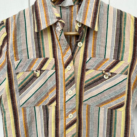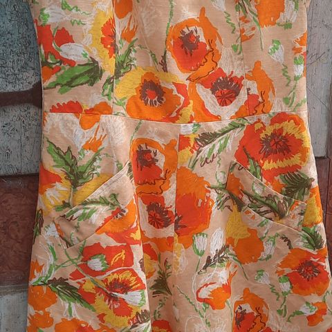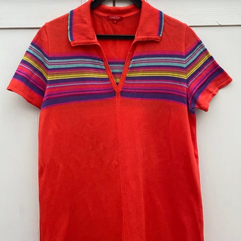 Kjole i 100% bomull jersey, str M. Made in Italy. Merke:Poletti. Gul med tverrgående striper/mønster i grått/grønt/hvitt. Rekker til ned på leggen. Kjøpt hos Bazar i Oslo. Fremstår som ny.
