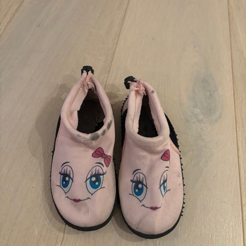 Badesko med enhjørning og mus i str. 26 selges. Brukt av ei jente.