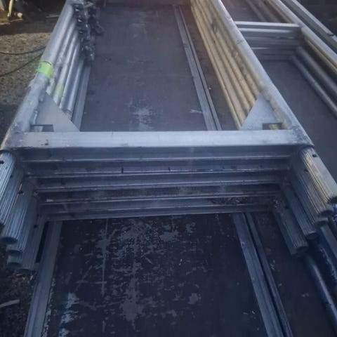 Aluminium Stillas til leie ca 120m2 14stk 2m ramme 4stk ramme 1m 13stk platform 18 stk rekkverk 4 stk diagonal 3,6 14 stk Stillbein 5 stl L 1m Pris 1000kr pluss mva pr Uke inkl tilhenger Sandefjord