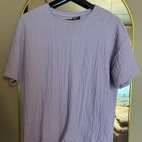 Lilla kortermet bluse/topp for dame i størrelse S. Toppen har krage, knappelukking foran og kort lengde. Stoffet har blomstrete mønster og bølgete avslutning nederst og på ermekantene. Passer som lett sommertopp eller til hverdagsbruk.